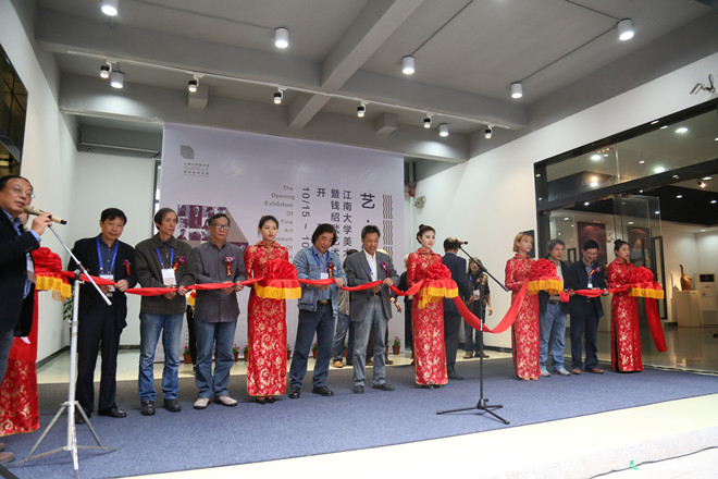 在现场嘉宾朋友们热烈的掌声中,南京艺术学院副院长、江苏省科普美术家协会理事长、教授何晓佑校友,校党委副书记周小浦,设计学院首任院长、张福昌教授,无锡市文联副主席、无锡市书法协会主席王建源,无锡市美术协会主席梁元;江南大学设计学院院长张凌浩教授;设计学院教授、美术馆馆长陈嘉全等共同为开幕展剪彩。随后,所有嘉宾、艺术家、校友们、师生们参观展厅作品,开幕首展从10月15日—25日免费向公众开放。开幕展当天下午分别举行了“艺·江南”画家座谈会和翁剑青教授主讲的“公共艺术与地方再造”学术报告会。