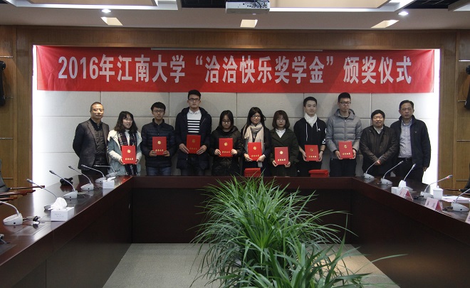 11月25日下午,2016年江南大学“洽洽快乐奖学金”颁奖仪式在行政楼B307举行。江南大学校长陈坚、合肥华泰集团董事长陈先保、洽洽食品股份有限公司副总裁巢骏及来自各学院的25名获奖学生出席本次仪式。江南大学校长助理兼学生工作处处长崔宝同、副处长张海峰等共同参加了活动。颁奖仪式由社会资源处副处长张文主持。
