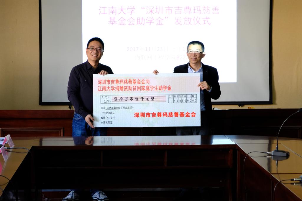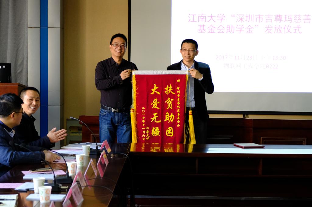 最后张博向江南大学捐赠助学金,黄敏向深圳市吉尊玛慈善基金会赠送锦旗,仪式在嘉宾与同学们的合影中圆满结束。