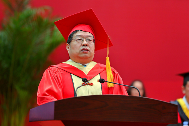 陈坚发表了题为《自省人生多意义》的讲话,祝贺全体毕业生学业终得圆满,祝愿全体毕业生人生行稳致远。怎样的人生,才算认真活过?陈坚和毕业生探讨了“自省”的话题。“自省”就是要不断思考、不断检视、不断完善,就是要博学、审问、慎思、明辨、笃行,自觉保持对时代变化的认知与反思,时刻省察在多变时代的选择与坚守。陈坚和毕业生分享了季克良校友、蒋高明老师、万芊同学的三个故事,以此向同学们诠释了自省人生的意义:自省人生,是忧乐天下、九难未悔的家国情怀;自省人生,是专注执着、无问西东的工匠精神;自省人生,是向善求真、里仁为美的理想追求。祝福毕业生拥有精彩未来!陈坚热情洋溢的讲话赢得了在场师生、毕业生亲友代表的阵阵掌声。