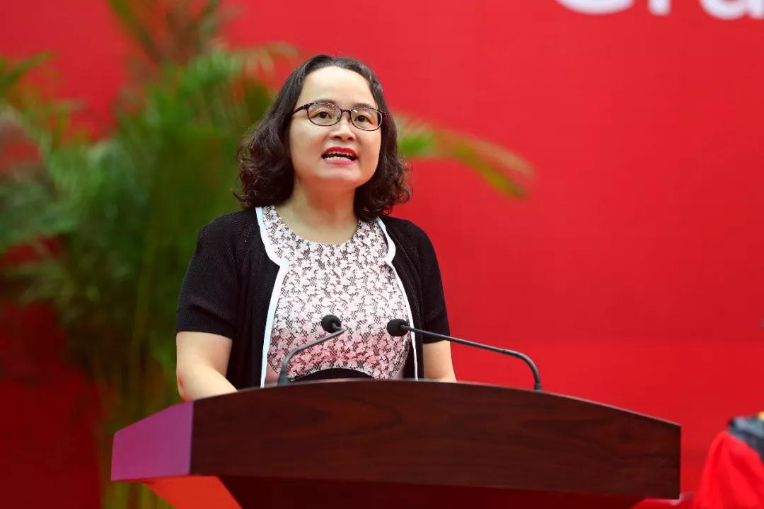 优秀校友、无锡威孚环保催化剂有限公司副总经理褚霞代表海内外17万天下江南人发言,她通过分享自己与企业共成长的感悟,勉励同学们选择自己喜欢的,并喜欢自己的选择,为之追求、努力和拼搏,体验成功与幸福,在人生舞台上活出自己的精彩。