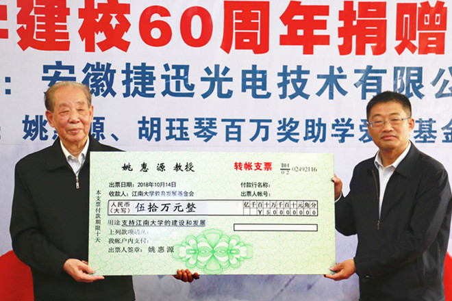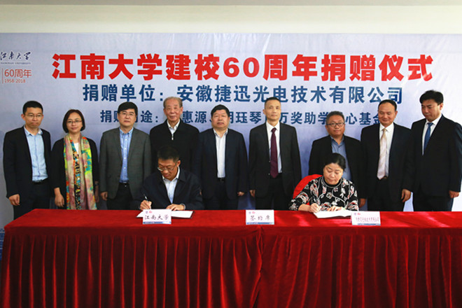 “姚惠源•胡珏琴百万奖助学爱心基金”理事长陈卫副校长代表学校分别与内蒙古恒丰食品工业股份有限公司董事长魏博、安徽捷迅光电技术有限公司总经理卢萍签订了捐赠协议,接受捐赠并颁发捐赠纪念牌。内蒙古恒丰集团股份有限公司原董事长魏建功、安徽捷迅光电技术有限公司董事长高小荣在讲话中表达了对江南大学60周年校庆的祝贺。两位企业家深感企业在发展过程中创新与人才的重要性,此次捐赠资助优秀的贫困学子,是受到姚惠源教授的精神感召,也是履行企业的社会责任。