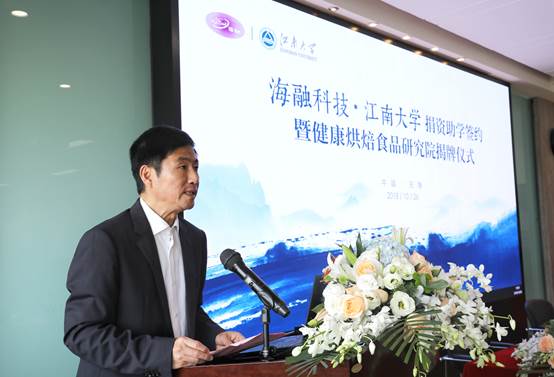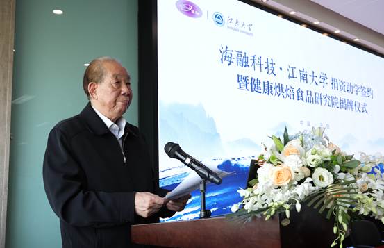 江南大学党委副书记戴月波在致词中向海融食品科技有限公司的善举表示感谢,他指出,此次捐资助学和共建研究院体现了以海融科技为代表的中国食品企业的强烈社会责任感和对食品工业强国梦的执着追求。中国焙烤食品糖制品协会张帅副秘书长表示,中国食品行业正面临着前所未有的挑战和机遇,需要高校和企业在新时代中共同努力,共创辉煌。海融科技总经理黄海瑚在讲话中强调,海融愿意与江南大学在人才培养、产品研发、业务互助等方面进一步深入合作,共同培养高精尖创新研究型人才,为烘焙行业注入新生力量,全面赋能大健康时代。82岁高龄的姚惠源教授对海融科技的捐赠表示了诚挚的感谢,他指出,此次江南大学与海融科技的联合将进一步提升人才培养和科研转化水平,为食品行业注入新鲜血液和活力。食品学院院长刘元法教授指出,企业和高校共同承担着满足新时代人民对生活新的诉求和美好向往期待的重大责任,希望通过此次捐赠与合作共同推动烘焙行业走向健康、创新、多元化发展。全国工商联烘焙业公会单志明副秘书长在会上指出,高校科技人才优势和企业的产业市场优势应当相互补充,共同打造中国烘焙行业发展共同体。