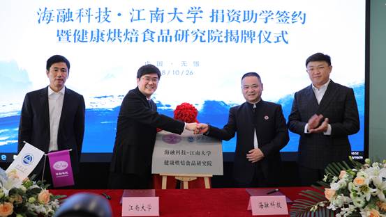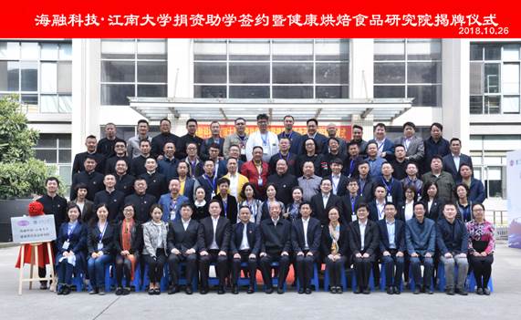 2018年10月26日上午,海融科技▪江南大学捐资助学签约暨健康烘焙食品研究院揭牌仪式在食品学院D912报告厅正式举行。中国焙烤食品糖制品协会副秘书长张帅、全国工商联烘焙业公会副秘书长单志明、上海海融食品科技股份有限公司总经理黄海瑚、江南大学党委副书记戴月波、江南大学社会资源处处长黄敏、食品学院党委书记向琪、院长刘元法等领导以及烘焙行业界70多位企业家出席活动。