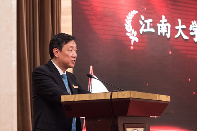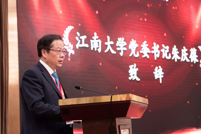 江南大学党委书记朱庆葆致辞,他代表学校向参加母校建校60周年校庆,以及2018年校友分会会长、秘书长会议的各位校友表示热烈欢迎,对承办本次会议的无锡校友会表示感谢。本次年会正值母校甲子校庆,天下江南人对母校给予了极大的关心与支持,各地校友会为办好校庆活动积极倡议、建言献策。朱书记号召广大校友共同努力,维护母校良好的声誉,并诚邀校友常回“家”看看,与母校保持亲密联系。