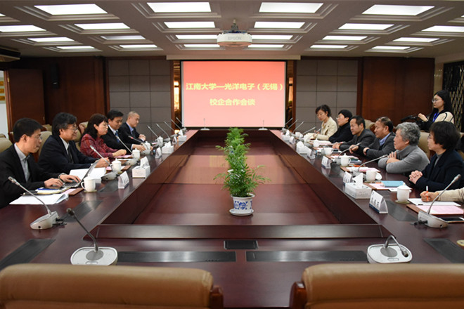 3月14日下午,江南大学—光洋电子(无锡)校企合作会谈在行政楼B305举行。出席本次会谈的有:同时兼任无锡研光汽车配件有限公司董事长、研光电子(无锡)有限公司董事长和光洋电子(无锡)有限公司副董事长的严金妹校友、光洋电子(无锡)有限公司技术总监梁川敏、副总经理高建刚、潘振云和总经理助理黄剑颖,江南大学副校长顾正彪、原副校长王武,君远学院、商学院、物联网学院及科研院、社会资源处等相关学院部门代表等。