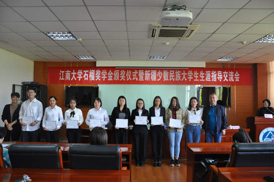 2019年4月19日下午,江南大学2019年石榴奖学金颁发仪式在文浩馆311会议室举行。我校校友、无锡市太湖国旅旅行社有限公司总经理雪合拉提,学生工作处副处长单筱婷,新疆驻江南大学内派教师叶尔江•哈力木、朱红琴出席了此次颁奖典礼,学生工作处学生管理科科长胡娟主持仪式。