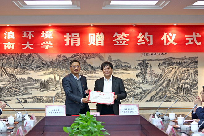 此次,无锡雪浪环境科技股份有限公司向江南大学捐赠300万,设立“江南文化研究发展基金”,用于支持江南文化、大运河文化带建设,以及提高江南大学学报办刊质量。杨建平与陈卫分别代表公司和学校签署了捐赠协议,社会资源处处长、基金会秘书长黄敏接受捐赠支票并向杨建平颁发捐赠证书。至此,无锡雪浪环境科技正式加盟我校董事单位。会上,聘请杨建平为我校特聘教授,陈卫为其颁发聘书,并佩戴江南大学校徽。