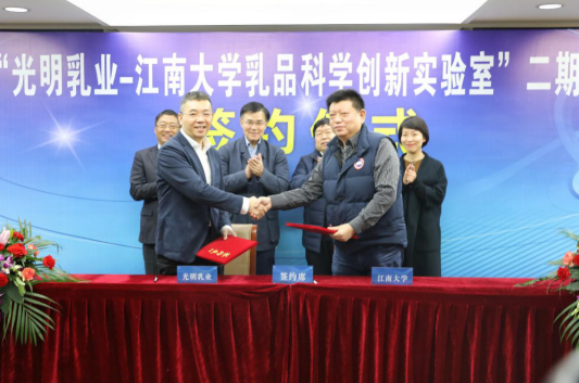 【新华网1月6日】1月2日,我校董事单位光明乳业与江南大学合作共建的乳品科学创新实验室二期合作签约仪式在江南大学举行。中国工程院院士、江南大学校长陈坚,中国工程院院士、江南大学副校长陈卫,光明乳业董事长濮韶华等专家及领导共同出席签约仪式。