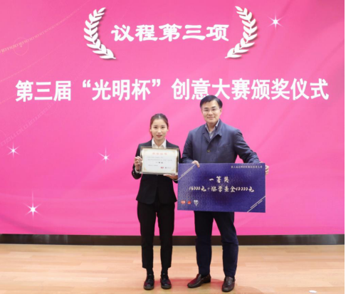 签约仪式结束后,濮韶华出席了“光明奖助学金”暨第三届“光明杯”乳品创意大赛颁奖仪式,并做主题演讲。