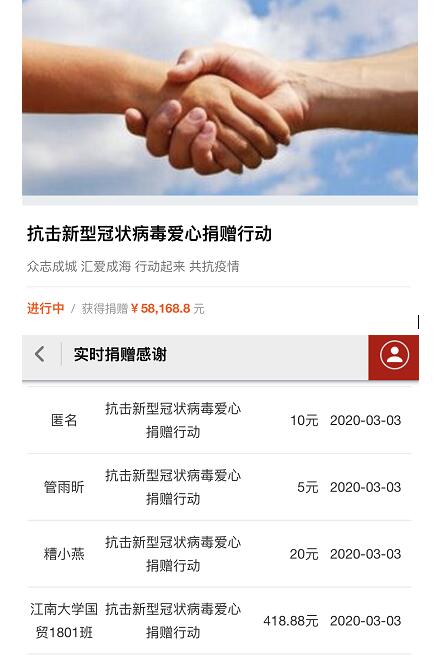 涓涓细流 网络云端献爱心。面对不断上涨的疫情数据,江南大学教育发展基金会设立“抗击新型冠装病毒爱心捐赠行动”项目,倡议大家伸出援助之手,加入到抗击疫情的行动中来。倡议发出后,得到了全体“天下江南人”、各级各类董事会、基金会、校友会的热烈响应。各学院院领导、教师、辅导员以身作则,积极参与捐赠,散落在各地的校友、学子也纷纷参与到爱心捐助中来,其中不乏身在疫区的学子、曾经得到过学校资助的学子、外国留学生,以及身在海外的校友;校友们有以班级为单位捐赠的,有以企业名义捐赠的,还有许多匿名捐赠,只留余香,静默无痕。