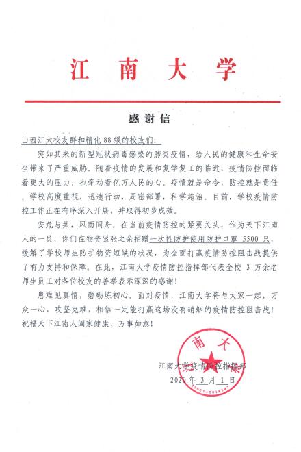 同心抗疫 各地校友齐聚力。“两个班,一个校友会,众筹2.5万元,遍寻4个国家,购买7500只口罩,只为一句承诺。”这是江南大学山西校友会的故事,为了达成校友们助力母校,共克时艰的愿望,精化88级两个班17位校友与山西校友会发起众筹,在短短3天内筹集到2.5万元,于泰国、印度、瑞典寻找供应商无果,最终通过北美义工购买到7500只口罩,送到母校。活动主要组织者、精化88殷链校友由衷祝福:“愿疫情早日结束,江大更现辉煌。”“天下江南,共抗时艰”,捐赠箱上的这句话字短情长,说不尽校友对母校的深情厚谊。一句“患难见真情,磨砺炼初心”道出母校的诚挚谢意。