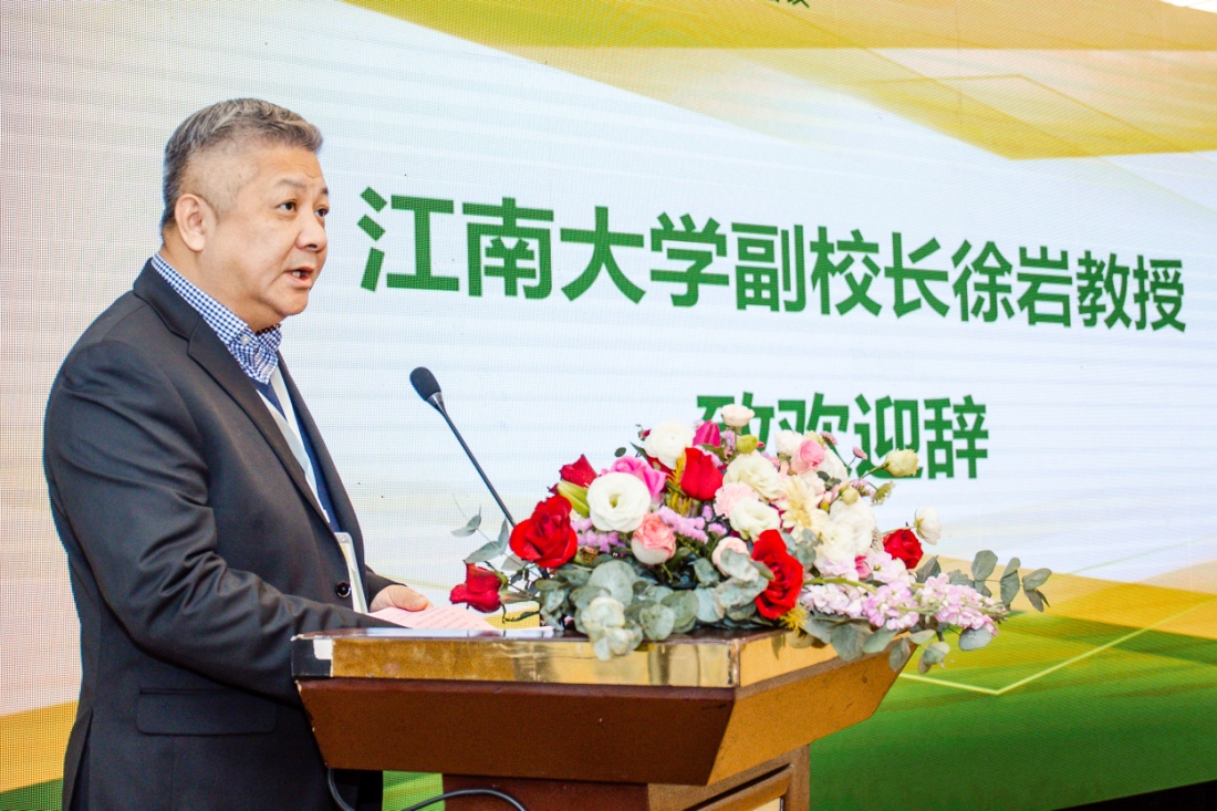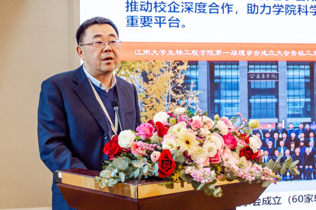 徐岩致辞,他代表江南大学向全体来宾表示热烈的欢迎。他指出,发酵工程学科的发展离不开社会各界的支持和帮助。生物工程学院理事会自2018年成立以来,不断加强与企业单位的合作与交流,通过科研、教学等多层面合作增强了办学活力,更好地服务了高校人才培养和地方经济社会发展。他希望在未来的建设周期,加快优质服务平台建设,为企业提供整体化的科技创新优化方案,不断紧密校企融合,打造“江南风格”的平台文化。