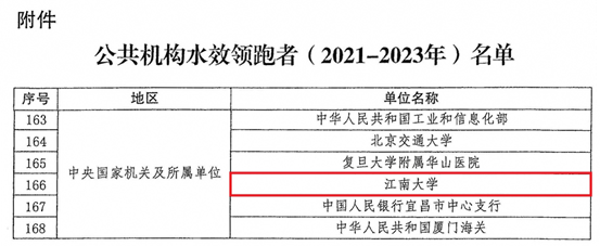 近日,由国家机关事务管理局、国家发展和改革委员会、水利部联合组织评审的“全国公共机构水效领跑者”名单发布,我校荣获“全国公共机构水效领跑者(2021-2023年)”称号。本次评审按照《全国公共机构水效领跑者引领行动实施方案》工作要求,旨在深入贯彻习近平生态文明思想,提高公共机构用水效率,更好地发挥示范引领作用。今年是“全国公共机构水效领跑者”的首次评选。