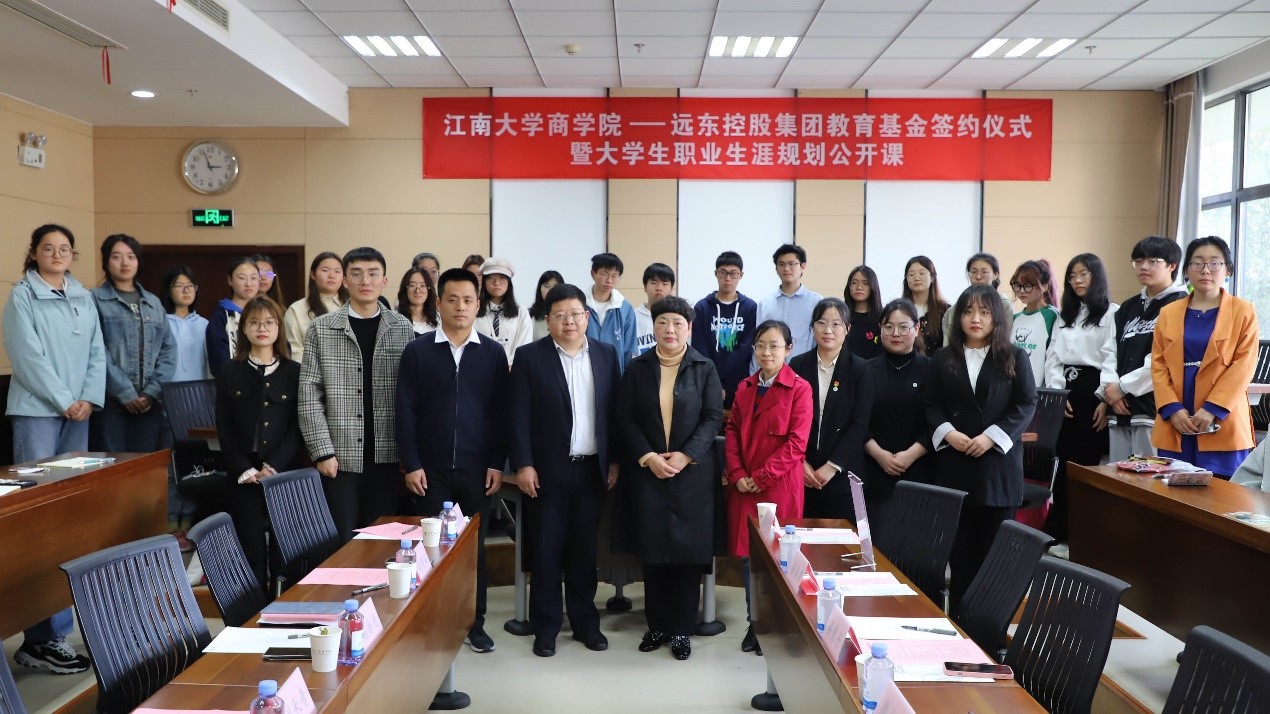 3月9日,江南大学商学院与远东控股集团教育基金签约仪式暨大学生职业生涯规划公开课在商学院东方厅隆重举行。远东控股集团资深顾问、远东股份资深合伙人、商学院企业家辅导员主席团主席周东佼,远东控股集团党政办主任助理康娜,人事类研究生梁隽子,商学院党委书记刘长青、院长浦徐进出席签约仪式,商学院五十余名学生代表参加仪式。仪式由商学院党委副书记徐静主持。