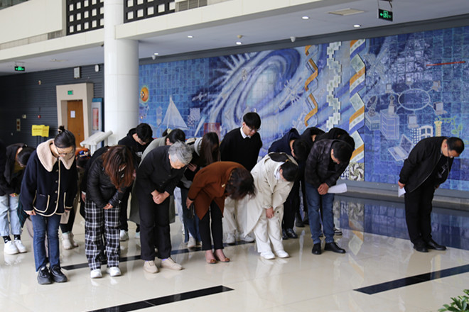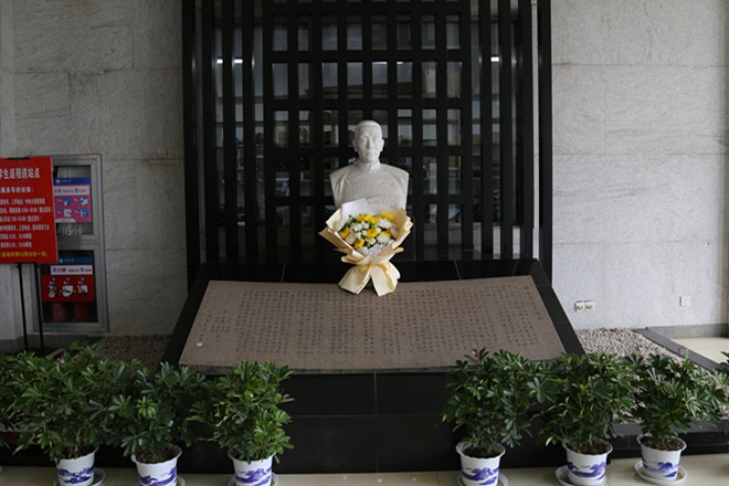 随后,志愿者同学向程文浩塑像献花,全体参会人员向塑像三鞠躬。