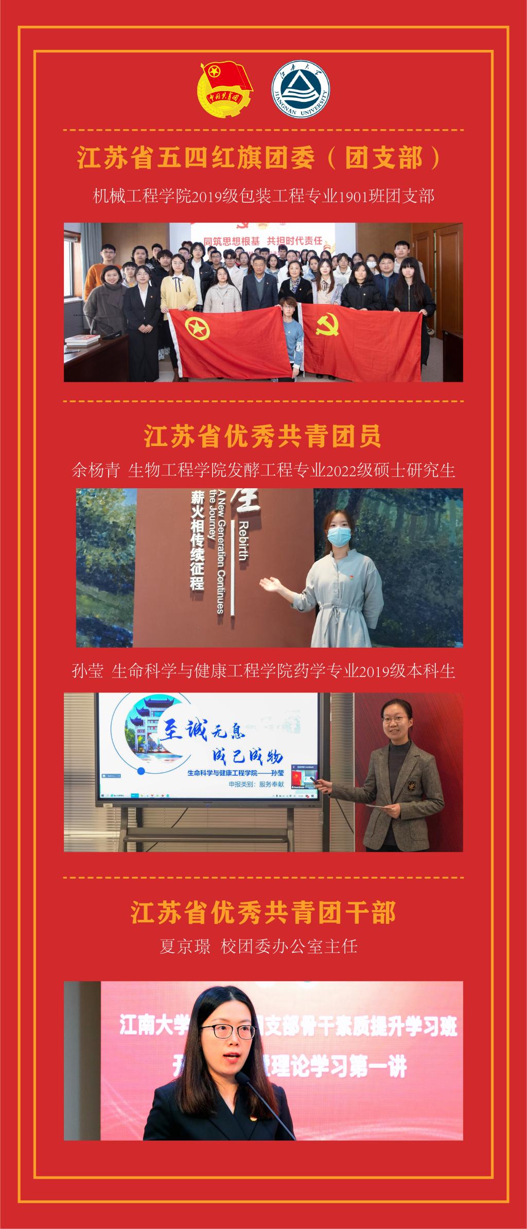 在2022年度全国高校“活力团支部”评选中,化学与材料工程学院高分子材料2019级3班团支部获评2022年度全国高校“活力团支部”最具好作风TOP100。在江苏省“青年五四奖章”和“两红两优”评选中,马克思主义学院唐忠宝老师获评“江苏青年五四奖章”,机械工程学院2019级包装工程专业1901班团支部获评“江苏五四红旗团支部”,生物工程学院学生余杨青、生命科学与健康工程学院学生孙莹获评“江苏省优秀共青团员”,校团委夏京璟老师获评“江苏省优秀共青团干部”。在2022年度全省青年志愿者行动先进典型评选中,江南大学团委获评“江苏省青年志愿服务事业贡献奖”,人文学院青年志愿者协会获评“江苏省青年志愿服务行动组织奖”,理学院“蓝阶梯”乡村振兴志愿服务项目获评“江苏省优秀青年志愿服务项目”,食品学院学生吕铃怡获评“江苏省青年志愿服务新闻宣传奖”,食品学院学生张志清、商学院学生杜彤获评“江苏省优秀青年志愿者”。