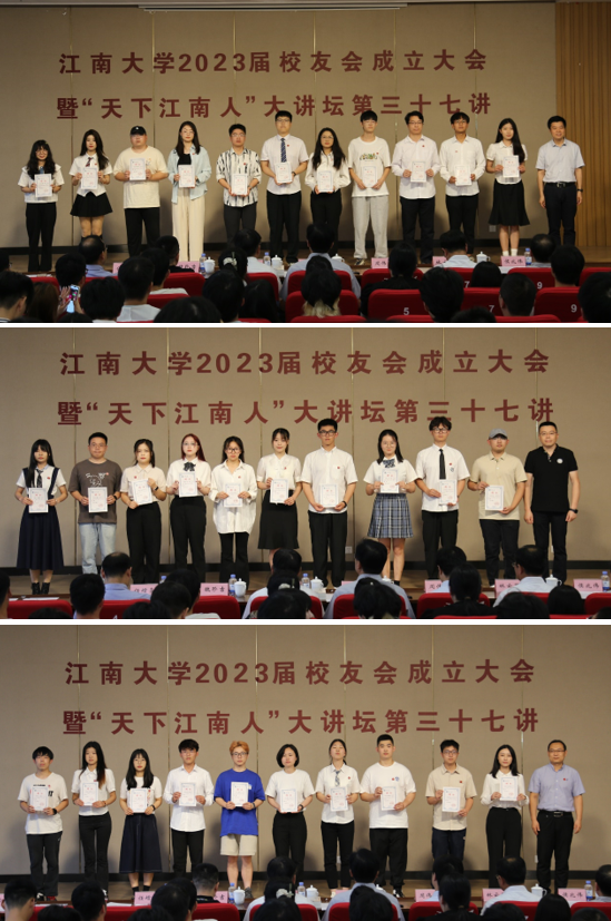 社会合作与校友联络处校友事务部主任宋志华介绍校友会发展情况并作2023届校友会成立筹备工作报告。林云鉴宣读《关于聘任江南大学2023届毕业生班级校友联络员的决定》和《关于成立江南大学2023届校友会(团体)的决定》,大会一致通过成员名单。周云龙为2023届校友会理事长颁发聘书。周伟涛、魏珍吉、任增亮为32位理事颁发聘书。