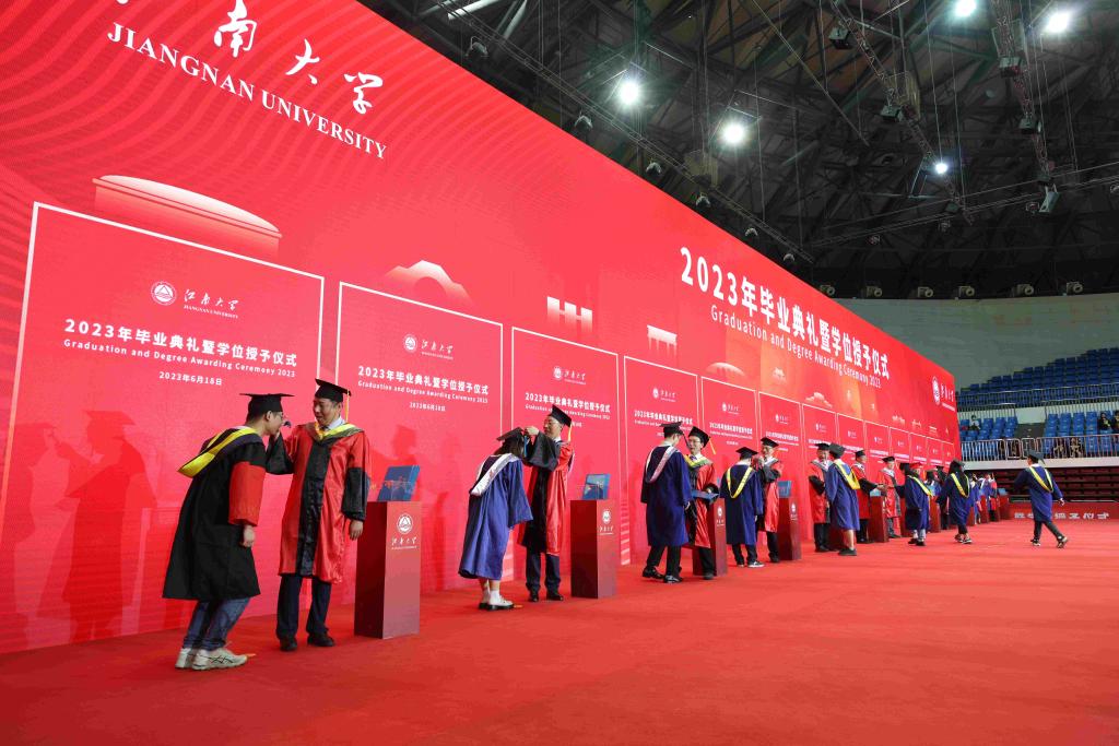 典礼结束后,江南大学2023年学位授予仪式隆重举行。校领导和各学院领导、教授为毕业生拨穗正冠,颁发学位证书并合影留念,为同学们在江南大学的学习生涯画上圆满的句号。