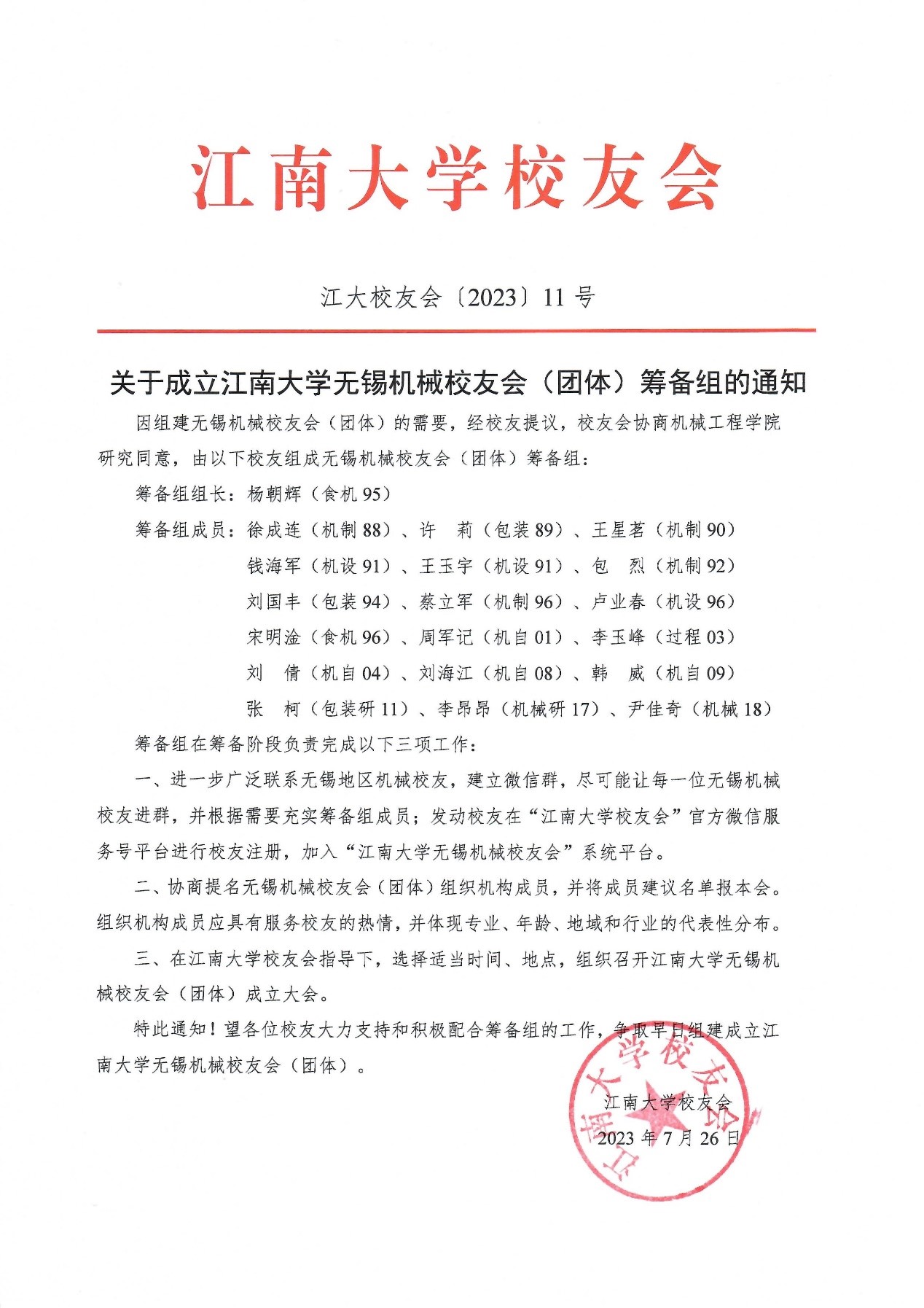 各位校友好!江南大学校友会以服务校友、母校和地区发展为宗旨,截至目前在海内外各地已建有114家校友分会。目前江南大学无锡机械校友会(团体)正在筹备中,筹备组和校友微信群已建立。