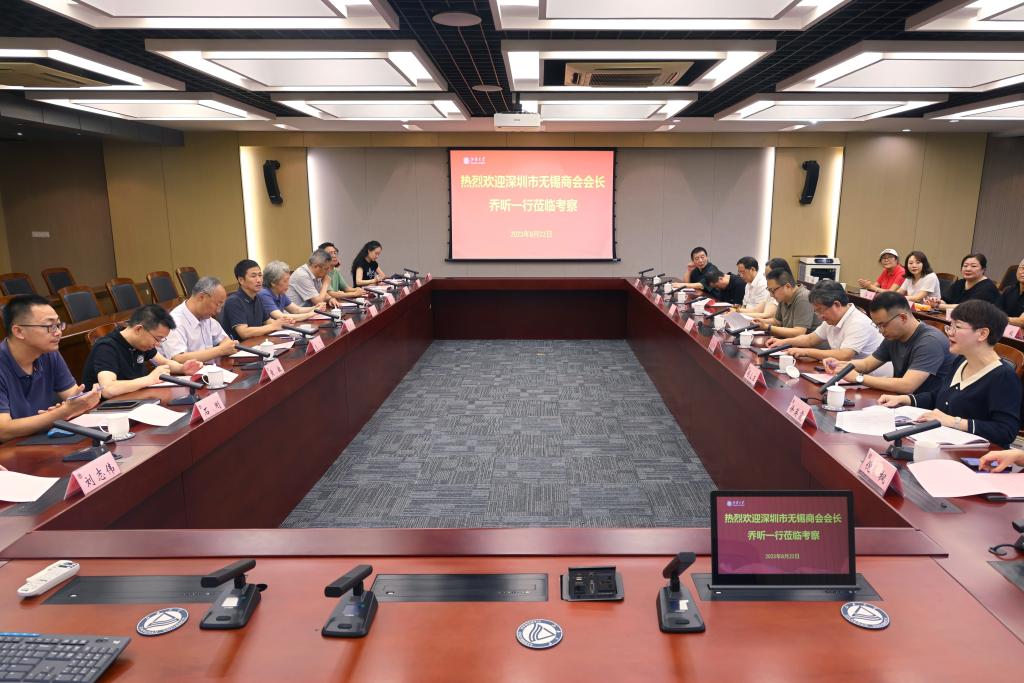 戴月波对乔昕一行的到来表示热烈的欢迎,对深圳市无锡商会以及市工商联长期以来对学校的关心和支持表示感谢。他就学校的总体办学规模、学科发展、社会美誉度以及国际国内影响力等方面做了简要介绍。他指出,深圳和无锡,一个是粤港澳大湾区、珠三角的核心城市,一个是太湖湾、长三角的几何中心城市。他希望,双方能够以本次交流对接为契机,共谋发展、达成共识,在更高层次、更深领域开辟和打造校企合作新样板。他期待,乔昕能率团常回母校、常回无锡,携手江南大学,助力“双湾”“两角”深度合作,共同推动教育链、人才链、产业链、创新链的有机融合,为学校高质量发展注入新动能,激发新活力。