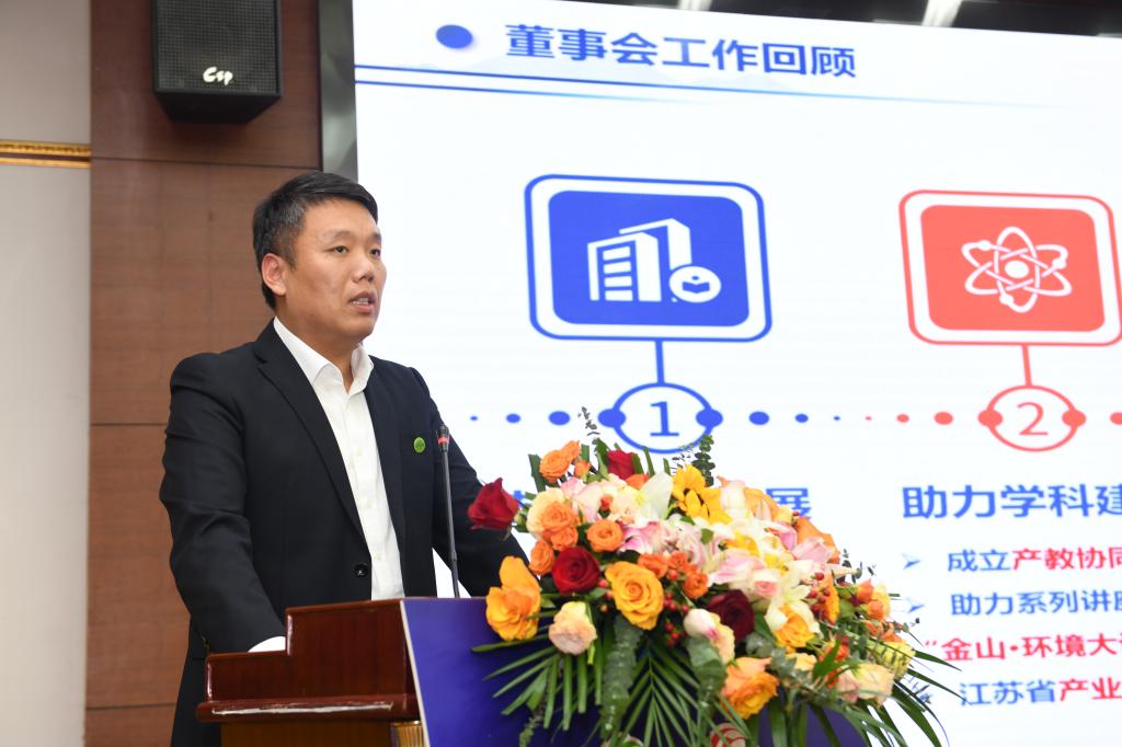 江苏金山环保工程集团党委副书记、总裁、董事会秘书长徐韬先生向大会作了董事会报告。他回顾了学院董事会发展历程,从支持学院发展、助力学科建设、人才交流培养、产学研用合作、携手党建联建五个方面介绍了近几年董事会发展的成果,也对新一届董事会建设提出了愿景。