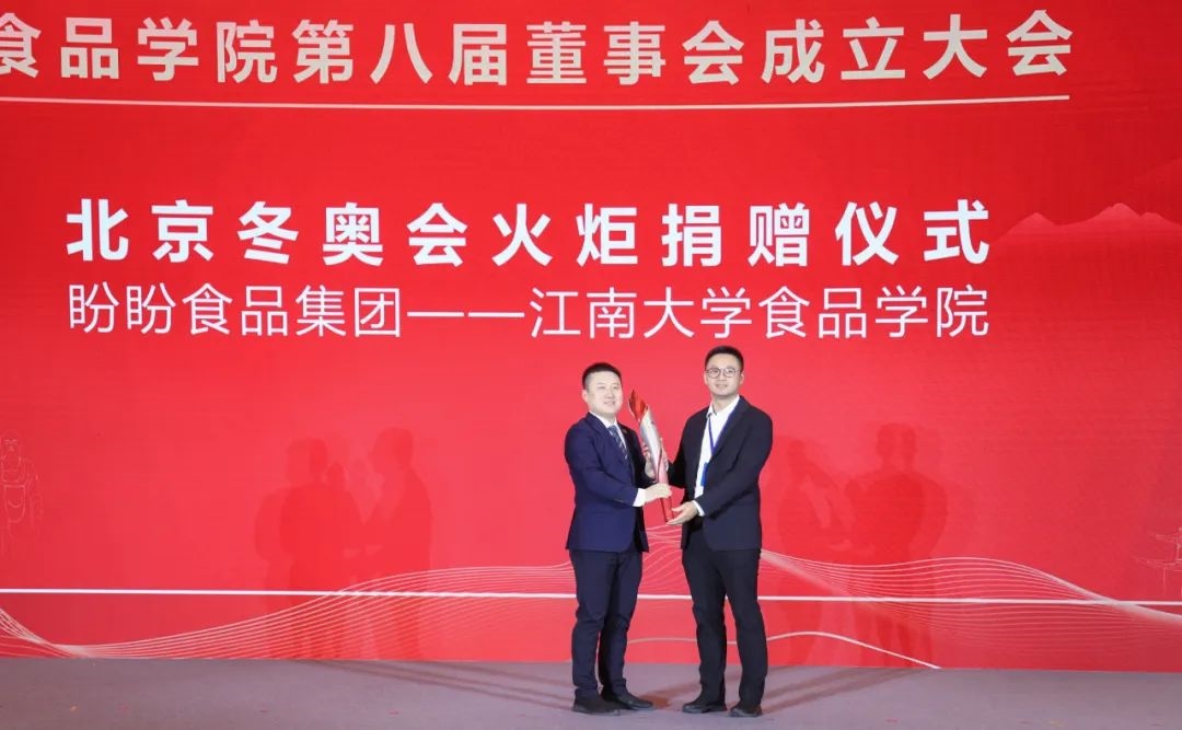 现场还举行“盼盼食品集团——江南大学食品学院”北京冬奥会火炬捐赠仪式。福建盼盼饮料有限公司总经理、伽那食品创始人蔡丕鹏向范大明捐赠火炬。