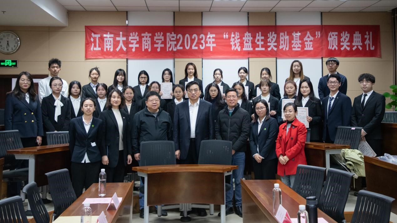 12月4日下午,2023年“钱盘生奖助基金”颁奖典礼在商学院116东方厅举行。江苏金山环保工程集团党委书记、董事长钱盘生,江南大学社会合作与校友联络处处长周云龙,商学院党委书记刘长青,江南大学就业指导中心主任兼学生工作处副处长单筱婷等出席颁奖典礼。“钱盘生奖助基金”全体获奖学生及优秀学生代表共50余人参加颁奖典礼。典礼由商学院党委副书记兼副院长徐静主持。