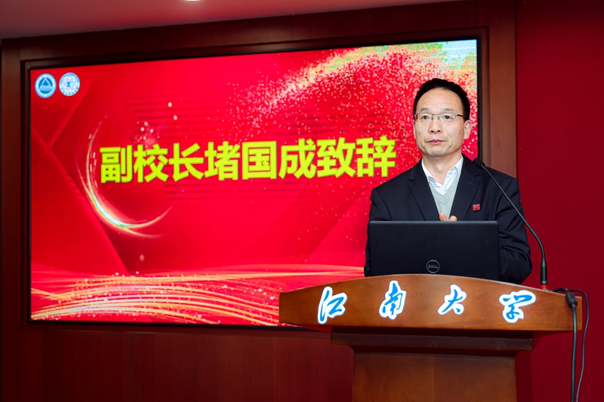 在嘹亮的江南大学校歌声中,大会拉开帷幕。堵国成首先向江南大学理学院无锡校友会的成立表示热烈祝贺,向各位校友长期以来对母校的关心支持表示衷心感谢;同时围绕学校“一体两翼”发展模式和“奋进计划”,从人才培养、学科建设、科研项目和社会服务等方面介绍了母校的发展情况。母校始终是各位校友个人和事业发展的坚强后盾,希望无锡校友会能够充分发挥“纽带”作用、“资源”优势和“名片”效应,凝聚广大校友和当地力量支持母校建设发展。