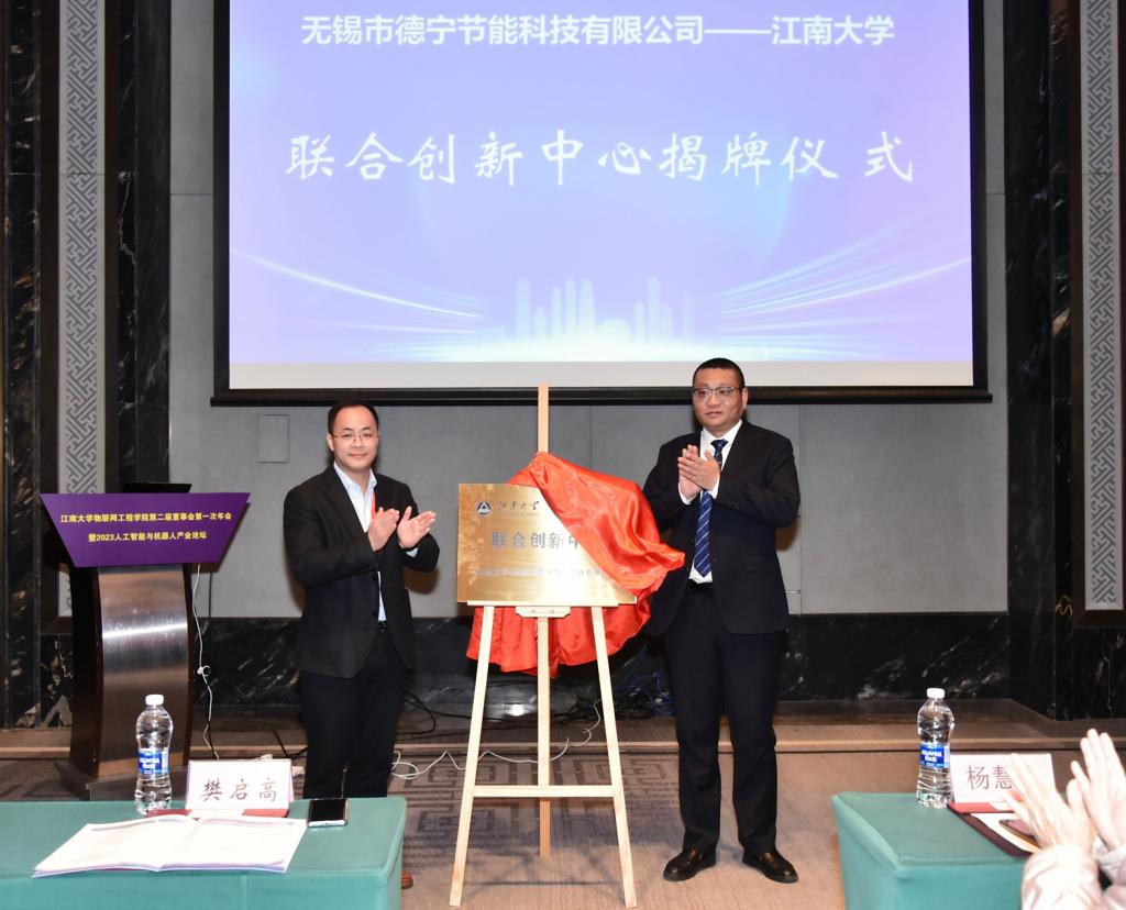 现场举行了“江南大学—无锡市德宁节能科技有限公司”联合创新中心揭牌仪式。樊启高介绍了中心前期筹备情况,他表示,无锡是物联网、智能制造、集成电路的产业高地,具有极大的产业基础优势;企业有人才培养的需求,而学生也需要高质量的就业,在此背景下,联合创新中心无疑是双方合作共赢的必然选择。物联网工程学院将不负协会与企业的期望,依托学院电子信息学科和省部级科研平台集中优势,在中心联建、课题联研、人才联培等方面进一步产出成果。随后,无锡市德宁节能科技有限公司董事长唐逸先生与樊启高共同为联合创新中心揭牌。