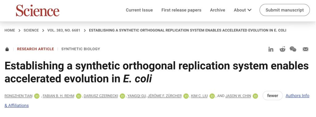 近日,来自英国剑桥MRC分子生物学实验室(MRC-LMB)的Jason Chin教授团队在Science杂志上发表了一篇名为Establishing a synthetic orthogonal replication system enables accelerated evolution in E. coli的文章,第一作者田荣臻是江南大学生物工程学院2014级本科基地班,2017级硕士研究生,硕博连读,2018级博士生(导师为陈坚院士)。他们首次在大肠杆菌中利用烈性噬菌体PRD1的基因组复制机器开发出稳定的大肠杆菌正交复制系统,并成功应用于靶基因的连续进化。