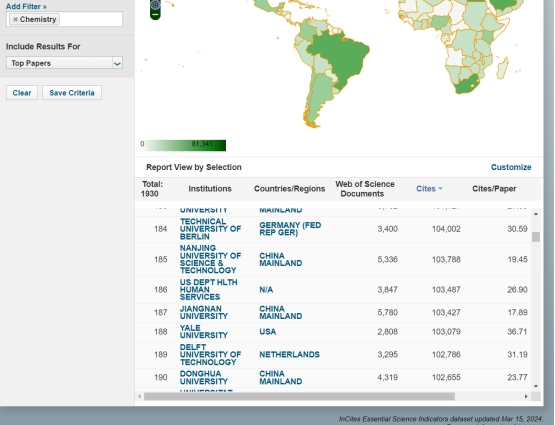 ESI(Essential Science Indicator)2024年3月15日最新数据表明:我校化学学科(CHEMISTRY)位于所有入选该学科ESI研究机构国际排名的前10%,进入化学学科领域前千分之一,标志着我校化学学科具备国际顶尖实力,进入卓越层次行列。这是继我校农业科学在2023年11月进入ESI世界前万分之一之后的又一重大进展。