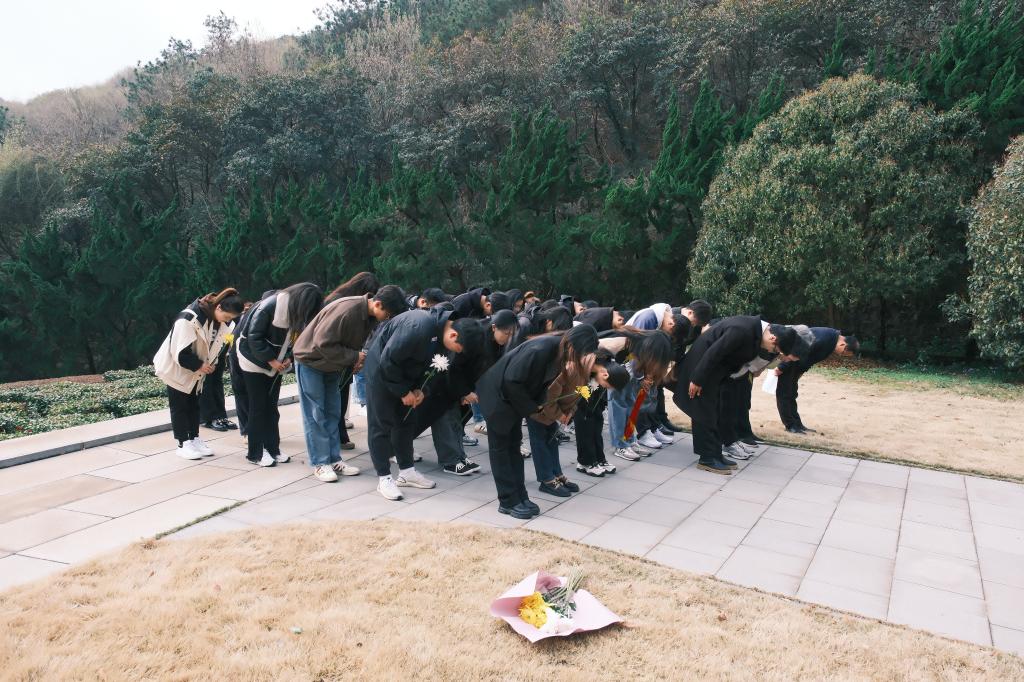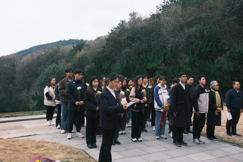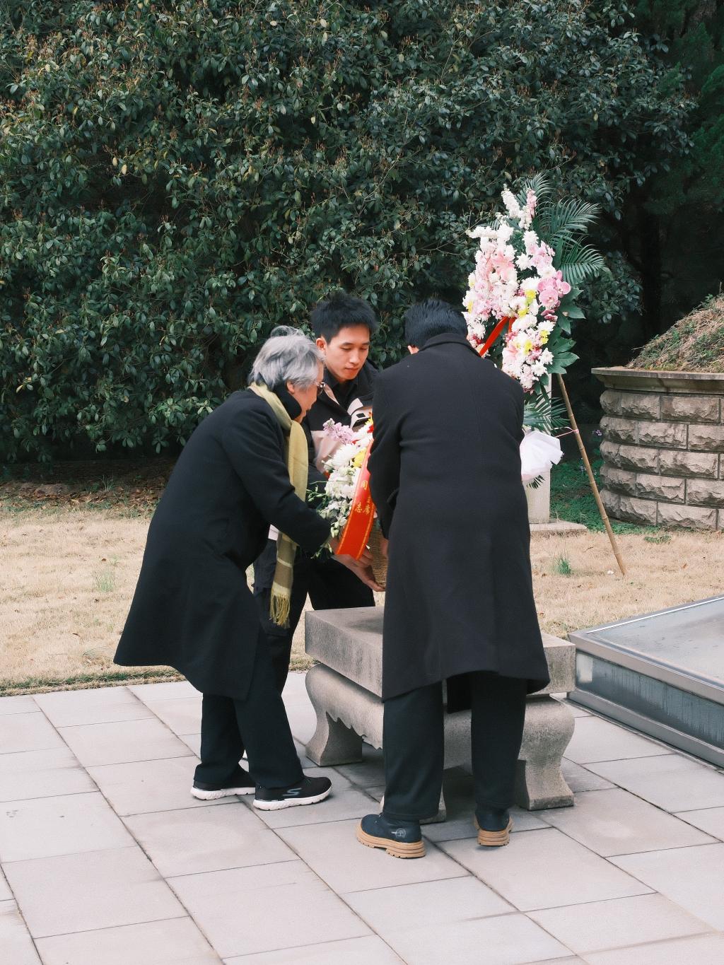 陵墓前,师生代表整齐列队,神情庄严肃穆。社会合作与校友联络处副处长任增亮主持祭扫仪式,他首先简要介绍了荣毅仁副主席生前长期关心国家教育事业,心系家乡,荣氏家族一直关心与支持江南大学发展的事迹。王武教授和学生代表向陵墓敬献花篮。学生代表生工2101谢思园同学献上祭文,追忆了荣毅仁副主席的丰功伟绩与爱国情怀,表达了对荣副主席的崇敬与追思,并表示定将继承并发扬荣氏精神,不负厚望,立志成才。参加祭扫的全体师生面向陵墓庄重静默,集体三鞠躬,并绕墓地一周,献上鲜花,以表达对荣副主席及夫人的深切缅怀和无限敬仰。