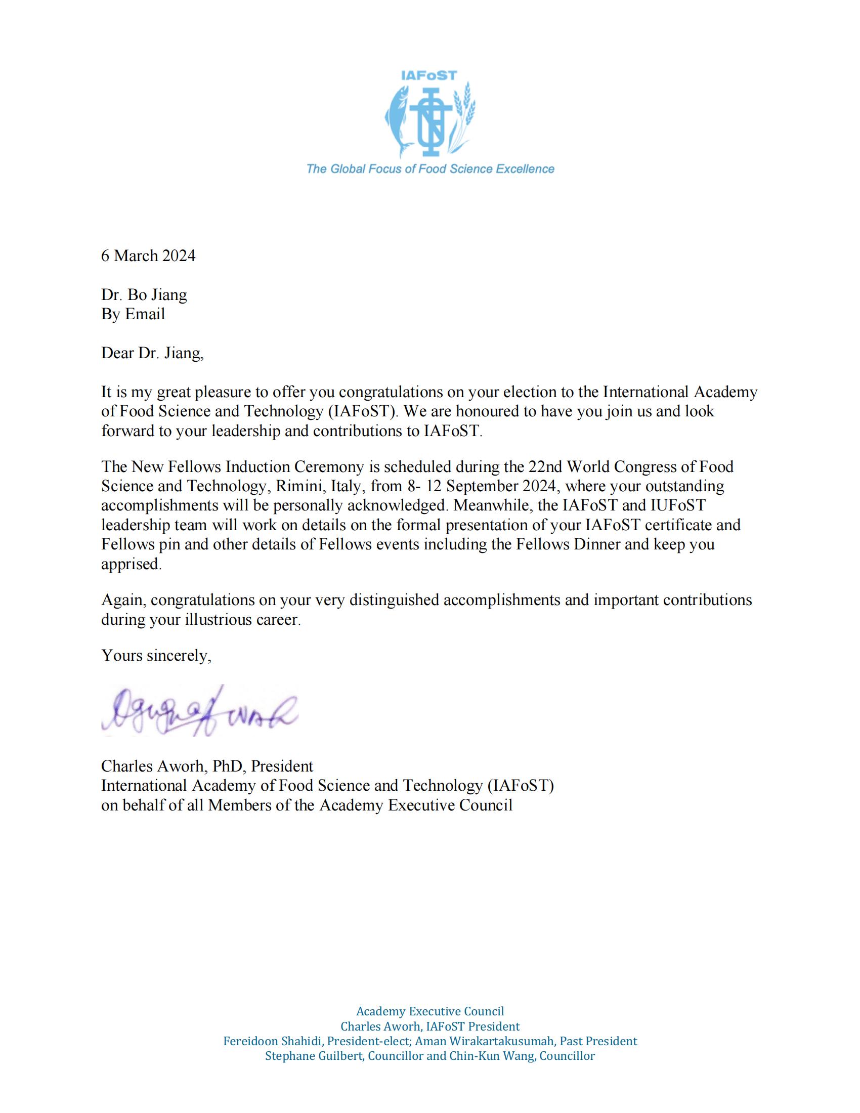 近日,国际食品科技联盟(International Union of Food Science and Technology, IUFoST)公布了国际食品科学院(International Academy of Food Science and Technology, IAFoST)新增院士名单,我校江波教授成功当选。