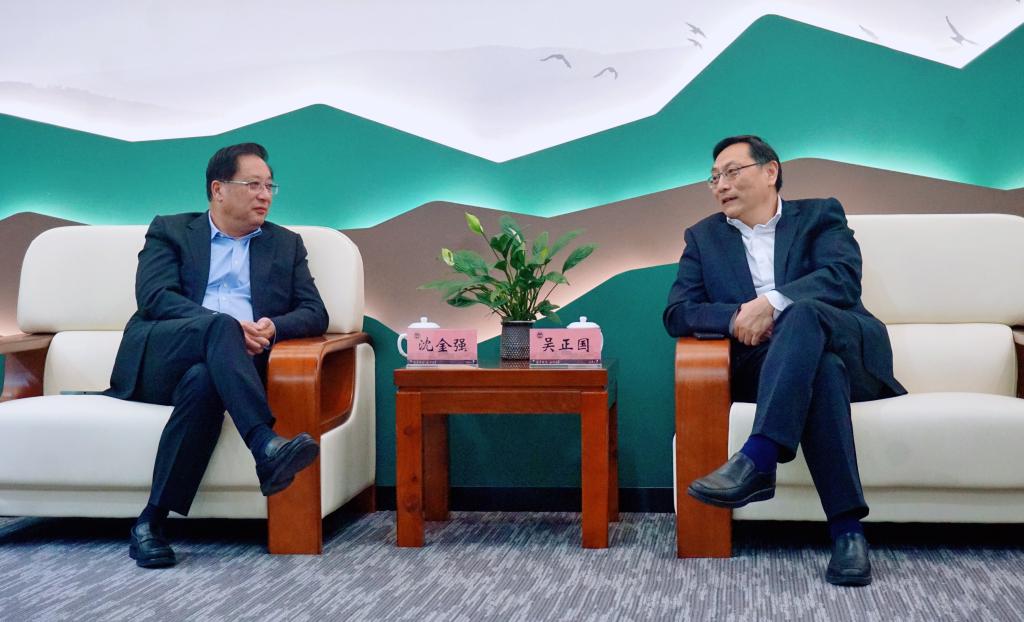 吴正国对沈金强的到来表示热烈的欢迎。他就学校的总体办学规模、一体两翼建设、优势学科发展以及国际国内影响力等方面做了简要介绍。他指出,近年来学校一方面持续强化一流学科建设,确保龙头学科做强做大;另一方面坚持深化校地合作,为地方人才培养、经济建设贡献江南力量。学校近年的快速发展,离不开广大校友的关心支持,希望沈金强能常回母校看看,为学校发展多提指导意见。