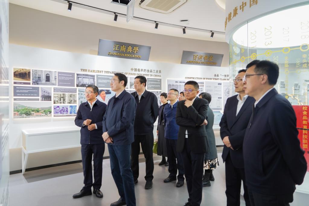 在食品学院调研时参观了食品学科史馆,食品学院副院长谢云飞介绍了食品学科兴学育才的发展轨迹,赵岩与吴正国、陈卫深入交流,对学校食品学科取得的斐然成绩表示钦佩,勉励食品学院持续发挥一流学科的优势,充分凝聚国家级平台的硬核力量,加大基础研究和产业应用力度,推动新质生产力动能培育,赋能科技创新高质量发展,为全省“双一流”学科建设树标杆、作示范。
