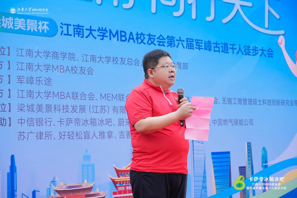 上午8时许,徒步大会开幕式正式开始,MBA2023级学生、MBA联合会副主席李岩主持开幕式。江南大学商学院党委书记刘长青致辞,刘长青表示在新中国成立75周年和奥运年举行徒步大会意义非凡,希望队员们在活动中以勇往直前、奋发向上、顽强拼搏的意志品质精神,在徒步锻炼中享受乐趣、增强体质、健全人格、锤炼品性。冠名赞助商梁城美景科技发展(江苏)有限公司品牌营销部崔鹏经理、连续两年支持活动的赞助商代表中信银行无锡分行副行长蔡映霞女士分别登台致辞。