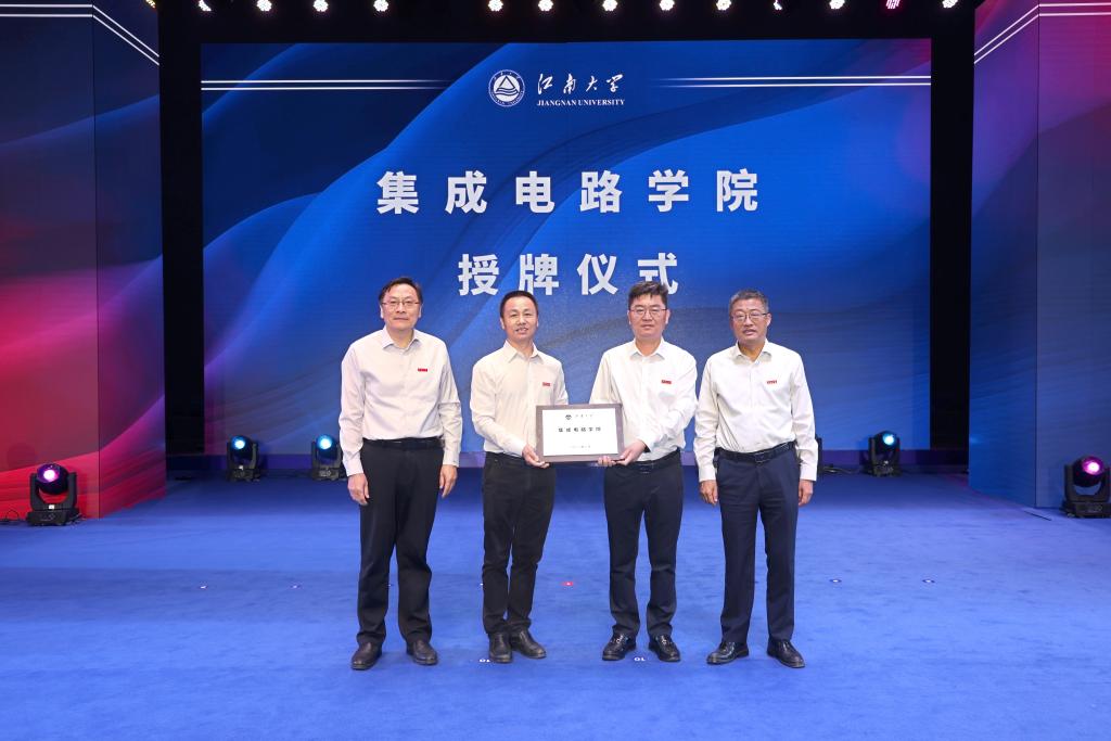 会上,张影陆宣读了《江南大学关于成立集成电路学院、智能制造学院(君远学院)、数字科技与创意设计学院、纤维工程与装备技术学院的通知》以及相关学院主要负责人任命决定。吴正国和陈卫共同为新学院授牌。