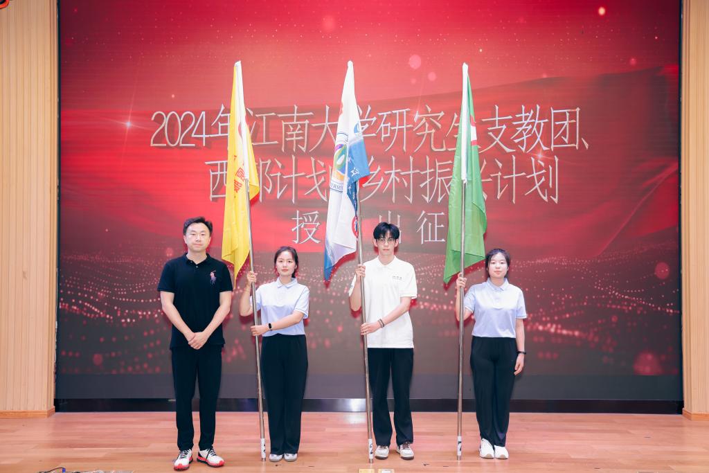 周伟涛、黄敏为我校2023年暑期社会实践先进单位颁奖。魏珍吉部署2024年江南大学暑期社会实践工作。团委副书记单云婷发布2024年暑期社会实践重点项目团队。李佳敏、李兆丰为2024年江南暑期社会实践团代表授旗。王维为我校2024年研究生支教团、大学生志愿服务西部计划、江苏大学生志愿服务乡村振兴计划入选志愿者代表授旗。