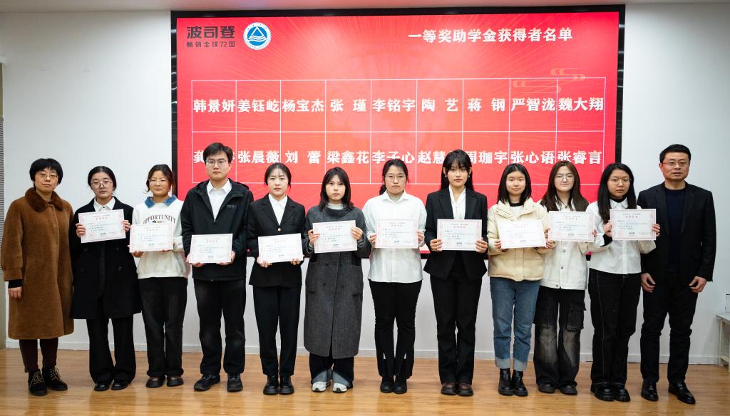 12月16日下午,纺织科学与工程学院在学院A103报告厅举行2024年“波司登公益奖助学金”颁奖典礼。波司登集团副总裁兼CHRO张磊、招聘负责人占佳男,纺织科学与工程学院党委书记张菁燕、副书记兼副院长杨莉勤、数字科技与创意设计学院辅导员章琳,纺织科学与工程学院辅导员伍胤鸿、孙慧、张旭以及获奖学生代表等100余人参加颁奖典礼,伍胤鸿主持典礼。