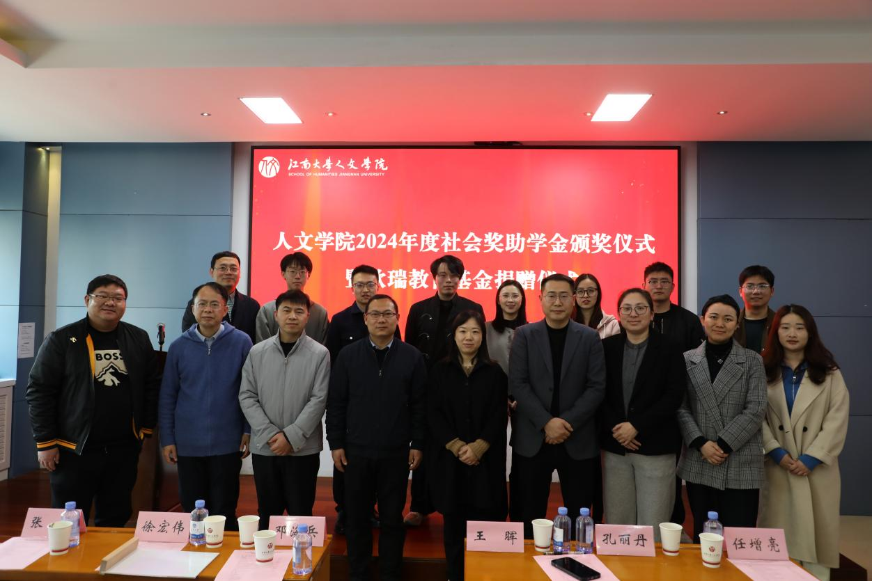 3月20日下午,江南大学人文学院2024年度社会奖学金颁奖仪式暨欣瑞教育基金捐赠签约仪式于田家炳楼209会议室举行。江南大学人文学院党委书记王晖,学生工作处副处长孔丽丹,社会合作与校友联络处副处长任增亮,人文学院党委副书记、副院长徐璐,江苏欣瑞教育、宏石酒行、上海杰星生物科技、无锡学而思、江苏新思域等相关捐赠单位代表以及全体获奖师生出席本次活动。人文学院分团委书记邓昌海主持本次活动。