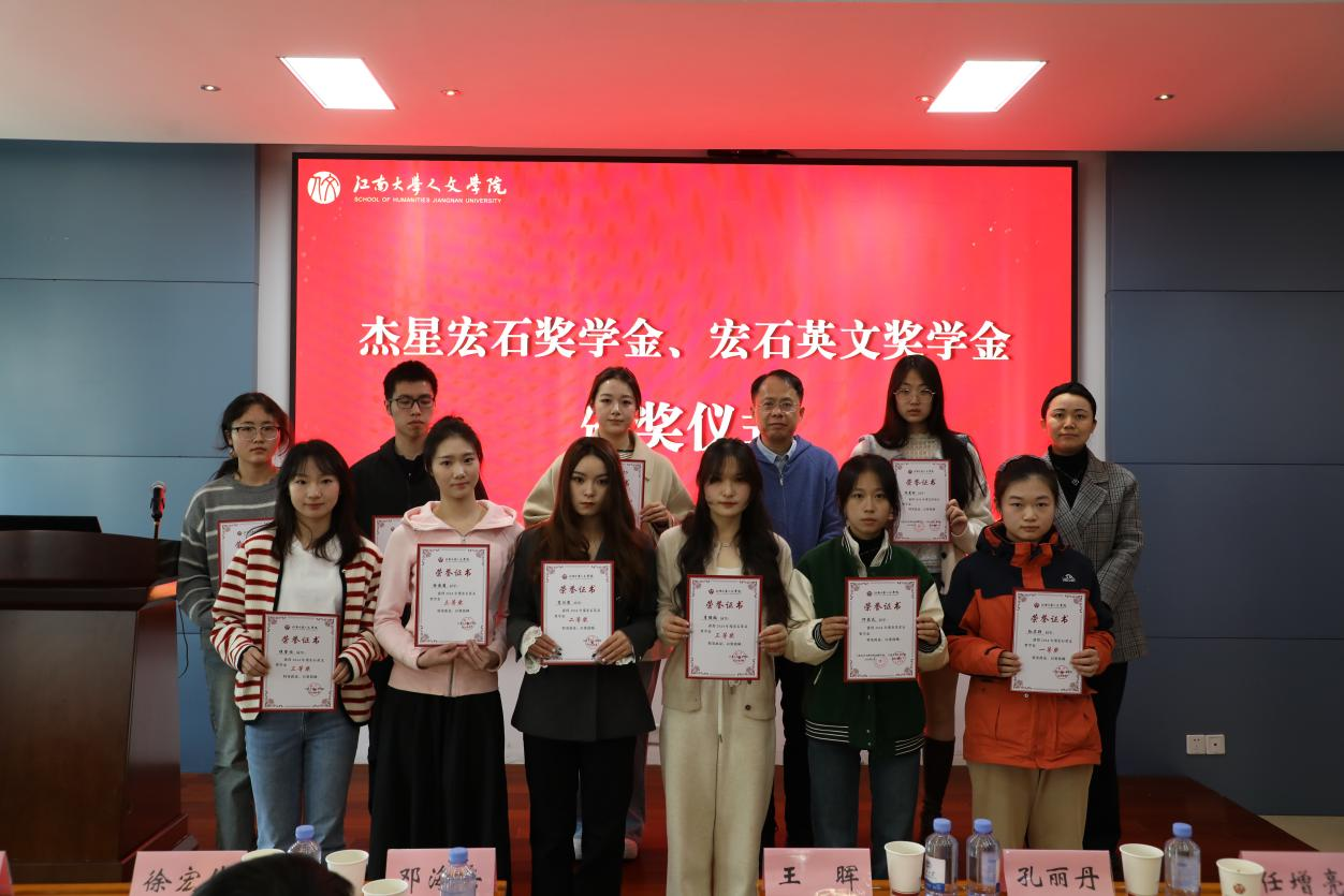 徐璐宣读获奖名单。人文学院校友会秘书长、宏石酒行总经理、上海杰星生物科技有限公司首席品牌运营官徐宏伟,无锡市宿迁商会副会长张海洋、监事长韩荣寨,江苏新思域教育科技集团有限公司总经理王斌分别为获得杰星宏石奖学金、宏石英文奖学金、同心惠美奖学金、新思域国际教育奖教金的师生颁发荣誉证书并合影留念。