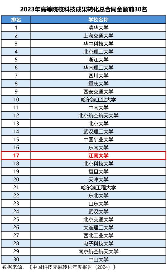近日,由中国科技评估与成果管理研究会、科技部科技评估中心、中国科学技术信息研究所编著的《中国科技成果转化年度报告2024》正式出版发行,同步揭晓了《2023年高等院校科技成果转化总合同金额前30名》榜单。学校入围最新高校科技成果转化排行榜30强,位列第17名,较2022年提升7名,我校连续六年位列前30名。