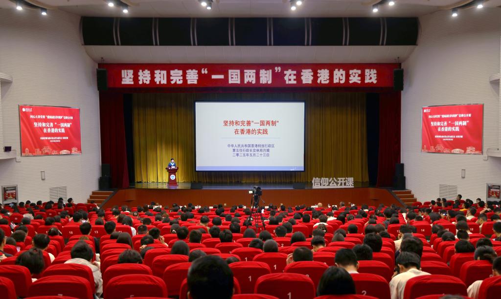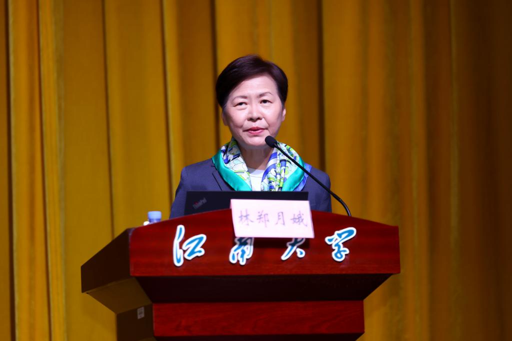 林郑月娥在演讲中,回顾了“一国两制”产生的历史背景和实践过程,介绍了香港特区的宪制秩序、特区行政长官的宪制地位,并强调要不断坚持和完善“一国两制”。她结合实践经验和个人体会充分说明,“一国两制”是香港保持长期繁荣稳定的最佳制度安排,必须坚定不移地贯彻执行。她还介绍了香港打造国际高端人才集聚高地和吸引海内外人才举措等内容,对江南大学取得的成绩表示肯定,并欢迎江南学子有机会到香港学习深造、成就事业。