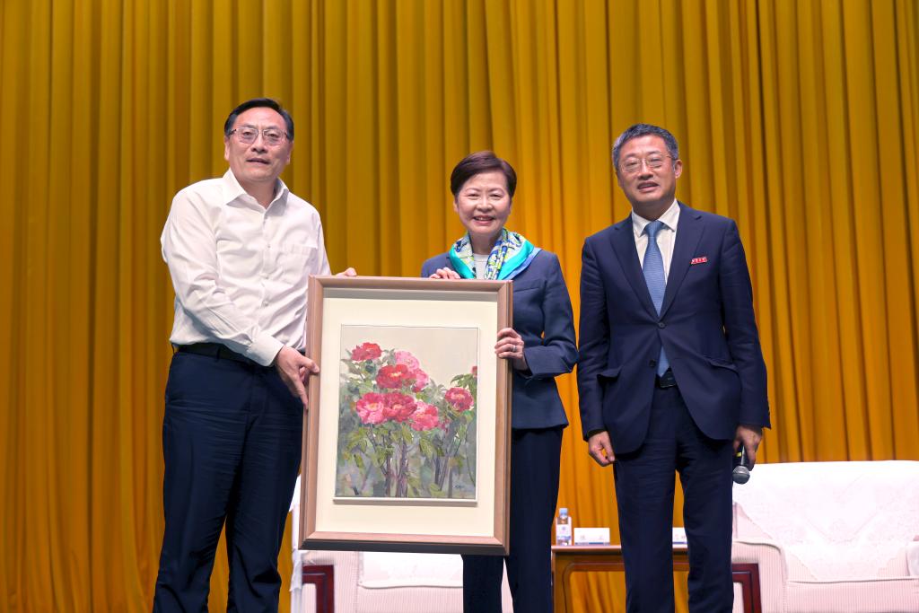 吴正国向林郑月娥女士赠送了由设计学院李春艳教授创作的水彩画《锦绣凝芳》,表达对林郑月娥女士的感谢,以及对苏港合作、家国共进的期许。学生代表向林郑月娥女士赠送鲜花,并围绕香港与内地青年共同弘扬中华文化、厚植家国情怀等方面进行提问交流。现场气氛热烈、掌声不断。