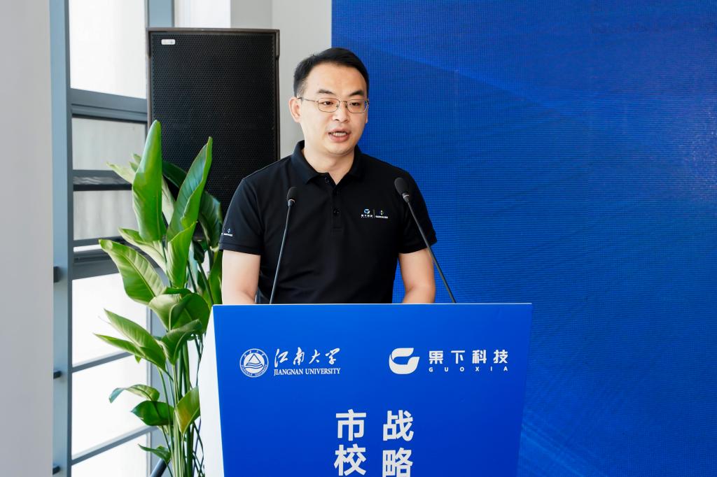 冯立正在致辞中表达了对母校培养的感谢,他指出,大学是创新的源头活水,企业是真实的应用场景,果下科技将以最大诚意和务实行动,与母校共建高水平实践平台、共担人才培养重任、共促科技成果转化,实现多方共赢。作为江南大学校友、果下科技天使轮投资人,陈俊德表示,此次签约不仅是一次合作,更是一次校友企业反哺母校、服务地方的生动实践,相信在政府引导、学校科研与企业市场三方合力下,合作必将结出丰硕成果。