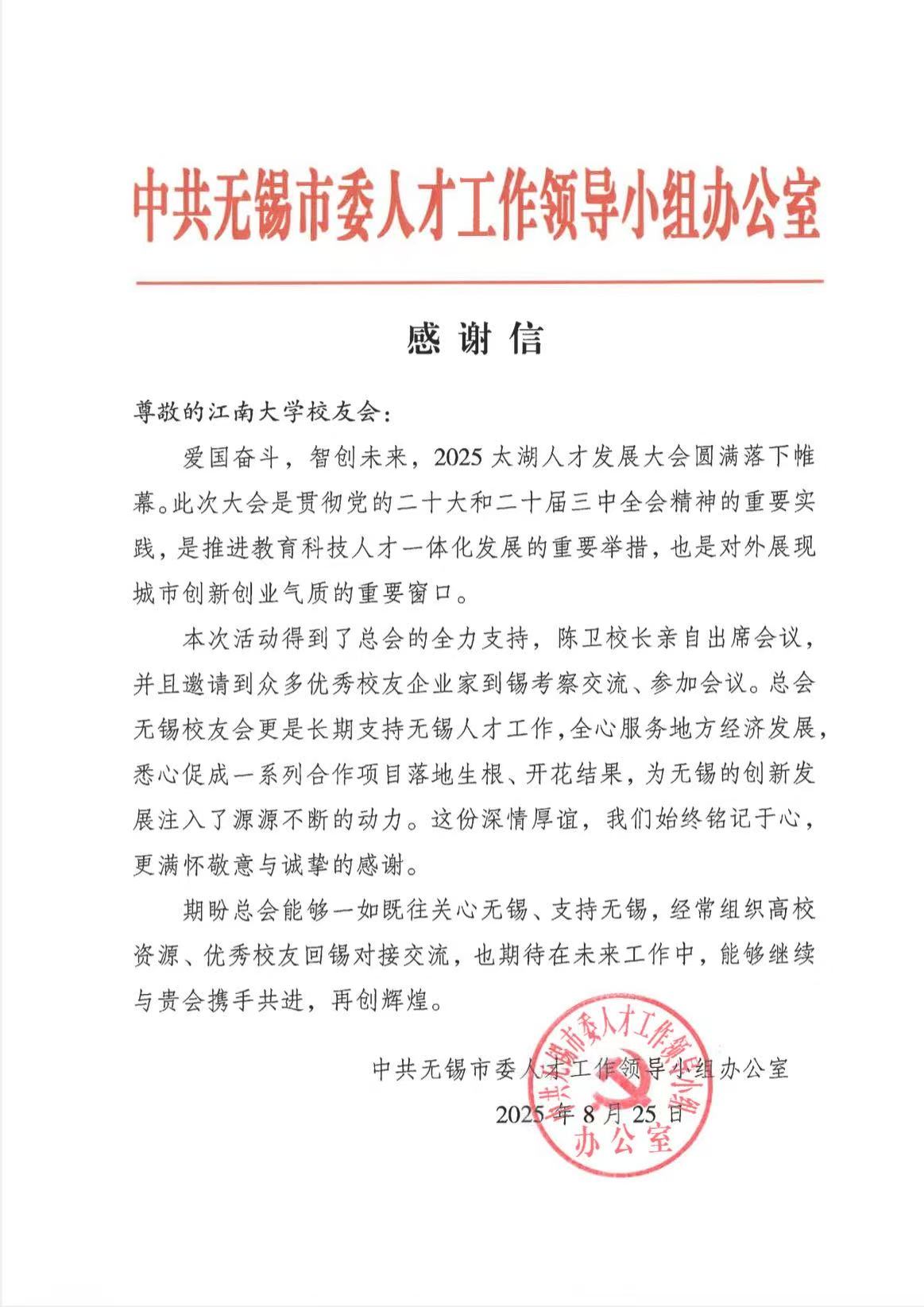 8月25日,江南大学校友会收到中共无锡市委人才工作领导小组办公室(以下简称“无锡市人才办”)发来的感谢信,对我校校友会在2025太湖人才发展大会中给予的大力支持表示诚挚感谢。
