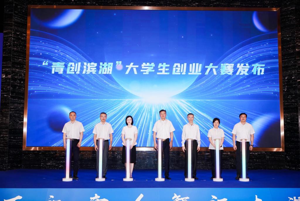 符惠明、庞锋华、朱隽昉、蒋维维、肖栋、宋晓裕、袁晓雷共同启动“青创滨湖”大学生创业大赛,标志着滨湖区在支持青年创业、构建多层次双创体系方面迈出新步伐。
