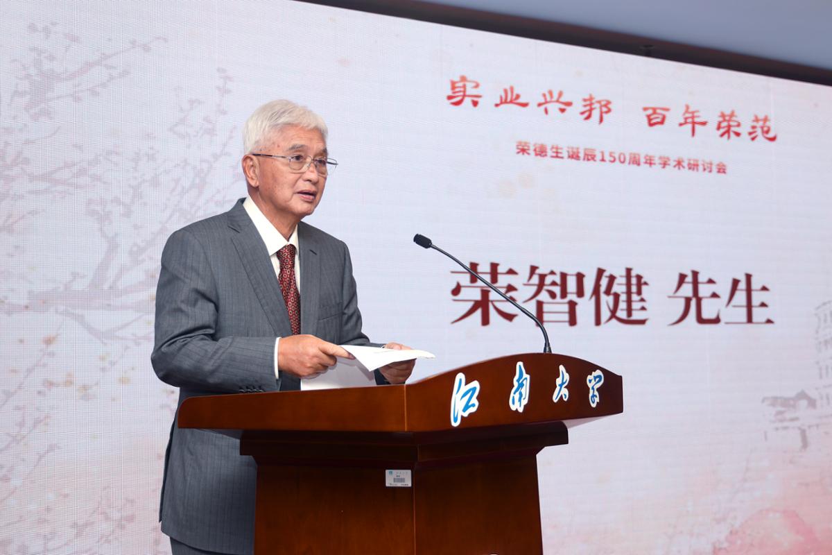荣智健代表荣氏后人,向组织举办本次研讨会的江南大学和荣德生企业文化研究会,以及各位专家学者的研究分享和企业家的热忱参会表示诚挚感谢。他深情回顾了祖父艰苦创业、爱国报国、追求民族富强的一生,以及大力兴办慈善公益事业,造福桑梓,回报社会的善行义举。他指出,荣德生经世济民的远见卓识对今天有四个方面的启示,包括经济发展的目的在于改善民生、保障民生;经济发展基于产业领域的开拓和市场需求的扩大;经济发展依靠设备更新、科技创新;经济发展必须遵循市场规则、社会伦理规范。他期待,荣德生先生实业救国、诚信立业、勇于创新、造福人民的精神能够一代一代传承下去,长久激励后继者,为更加美好的未来而不懈奋斗。