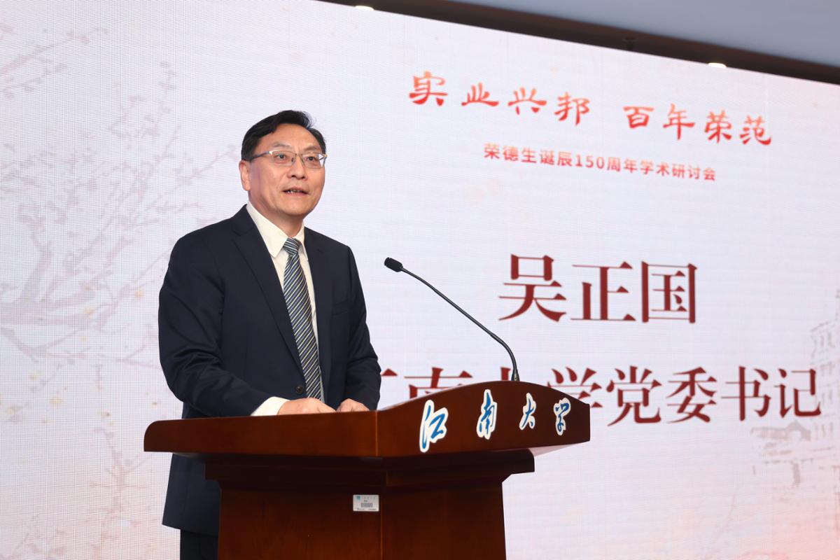 吴正国在讲话中,对荣智健先生以及荣氏家族一直以来对学校的信任和厚爱表示感谢,并向各位领导、嘉宾和专家学者的到来表示热烈欢迎。他指出,荣氏家族以家国情怀为根脉,以教育传承为己任,与江南大学的发展结下了深厚渊源,这种一如既往的家国情、教育情、江大情已成为学校发展历程中不断坚守初心、奋楫笃行的精神力量。他强调,本次研讨会旨在追忆荣德生的爱国情怀、创业硕果和人生价值,启迪激励年轻学子和新一代企业家,弘扬爱国之情和报国之志。他表示,学校将始终赓续“实业兴学”的办学传统,坚持弘扬“崇实笃行”的校风学风,聚力传承“经世致用”的办学精神,奋力谱写“中国特色、世界一流、江南风格的研究型大学”新篇章。